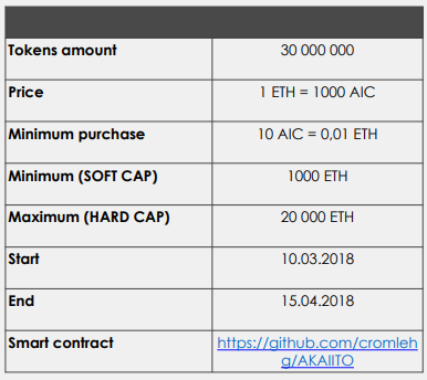 In order to successfully realize the project AKAIITO will be launched the sale of AIC tokens. AKAIITO will release 30 million AIC tokens. For sale will be released 22.5 million AIC tokens. The entire number of sales tokens will be divided into 2 steps: Pre ICO and ICO. During Pre GMO sales will release 1 million AIC tokens and during ICO sales will be released 21.5 million AIC tokens (number of AIC tokens released will depend on ETH level).