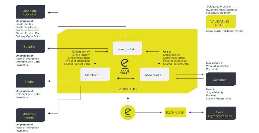As mentioned earlier, Omnitude is built on Hyperledger, an open source protocol allowed by Blockchain that enables business-to-consumer and business-to-business transactions. The diagram above illustrates the interactions between different entities such as traders, customers, suppliers and ECOM use within the ecosystem.